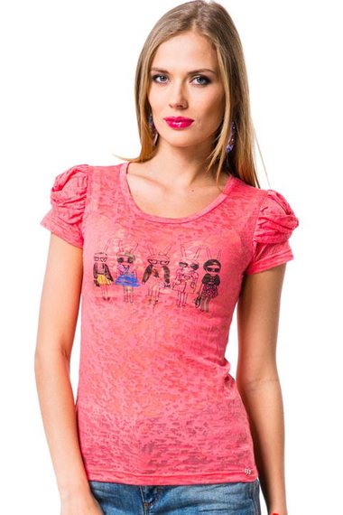 Футболка розового цвета с изображением модных кроликов. Модель сшита из приятной тонкой ткани с полупрозрачной текстурой, имеет приталенный крой, короткие, присборенные рукава и круглый вырез.