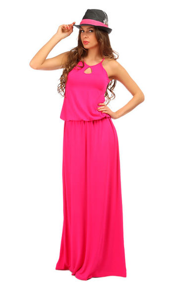Классное летнее платье из вискозы. Модель яркого малинового цвета, без рукавов с каплеобразным вырезом в области декольте.