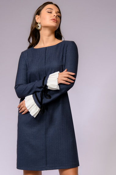 Темно-синее платье из фактурной ткани с контрастными манжетами 1001 DRESS